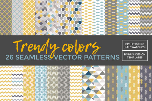 • 26 stylish geometric vector patterns, in EPS, PNG, JPG formats, + AI Swatches