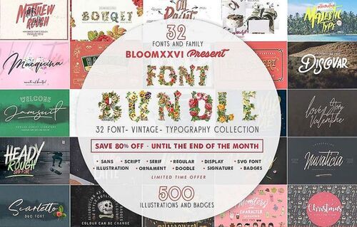 • Bundel eksklusif dengan 32 jenis font unik, termasuk versi SVG dengan efek berbeda.