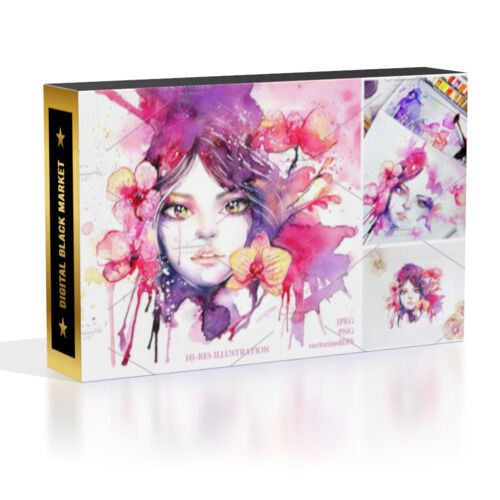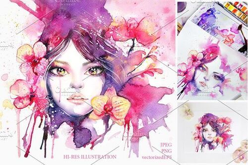 Meet Orchid Fluide, a luxurious watercolor painting of a beautiful woman decorated with orchid flowers. Vibrant color palette with vivid pink, purple and soft yellow looks trendy and elegant. The high quality of scanning and post-processing remains all details and color nuances.
