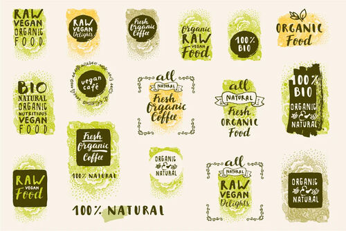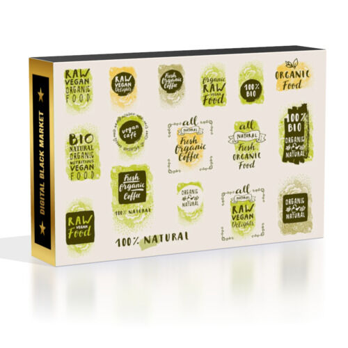 Retro style vector set of 100% bio, organic, gluten free, eco, healthy food labels, logo templates, badges with floral and vintage elements on a light beige background. Great for restaurant menu or food packages. No fonts used, only hand drawn stuff.