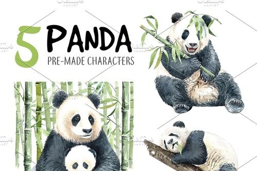 • 5 karakter panda dan bambu yang sudah jadi dengan latar belakang transparan (PNG)