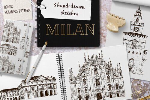 The set of Milan sketches includes: 3 hand-drawn sketches (AI, EPS, 5000 – 5000 pixels JPEG and transparent PNG) + 1 seamless pattern (AI, EPS, 5000 – 5000 pixels JPEG and transparent PNG).